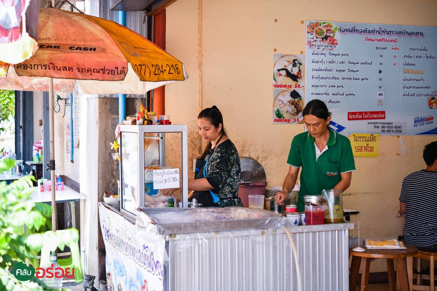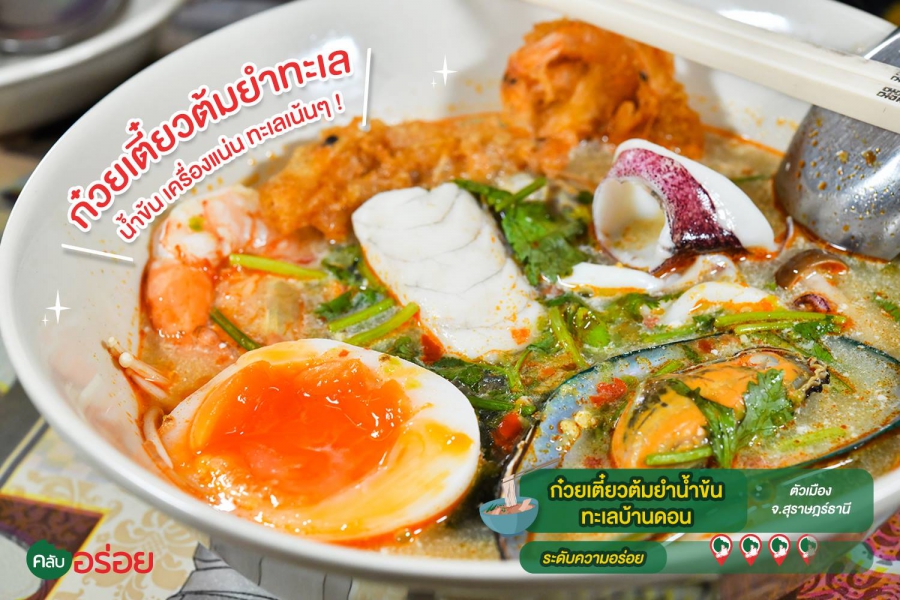 ร้านก๋วยเตี๋ยวซีฟู้ดที่อยากแนะนำให้มาลองอีกหนึ่งร้าน ถ้ามาถึงสุราษฎร์ครับ ที่นี่ขึ้นชื่อเรื่องก๋วยเตี๋ยวต้มยำน้ำข้น รสชาติเข้มข้น หอมมันเหลือเกิน เครื่องเคียงเป็นซีฟู้ดสดๆ จัดให้เน้นๆ เต็มชาม ทั้ง กุ้ง หอย ปู ปลา ครบครัน แถมด้วยไข่ต้มอีก 1 ใบ ก่อนสั่งเจ้าของร้านจะถามก่อนเลยว่าทานรสจัดมั้ย เพราะรสชาติธรรมดาๆ ก็ค่อนข้างที่จะเผ็ดอยู่แล้ว แต่ถ้าอยากเต็มสูตรบอกให้เจ้าของร้านจัดให้ได้เลย รับรองมีน้ำตาไหลเพราะความเผ็ดสมใจแน่นอน นอกจากก๋วยเตี๋ยว ที่นี่ยังมีเมนูอาหารจานเดียวที่อยากแนะนำอย่าง “ ข้าวกุ้งอบกระเทียม ” ที่ทำมาสีสันสวยงามและ รสขาติอร่อย เกินมาตรฐานร้านริมทางครับ !