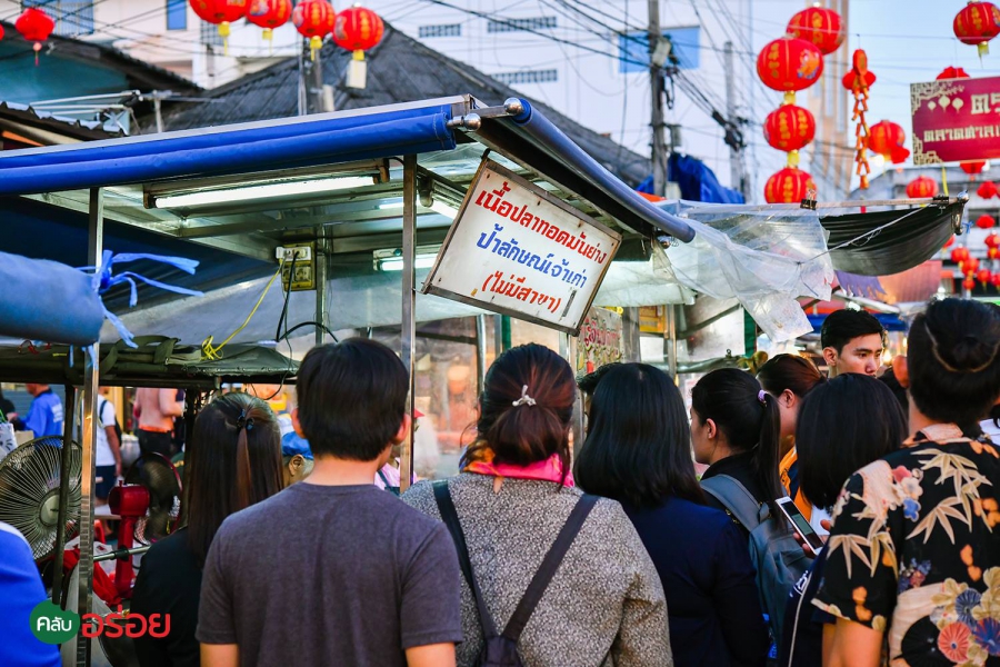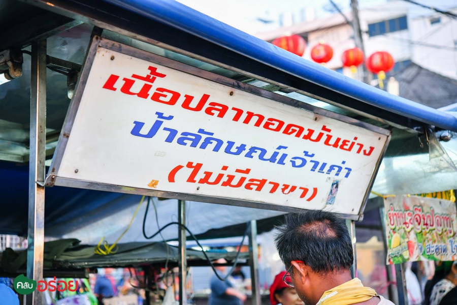 เพราะตำแหน่งตรงนี้ คือที่ตั้งของร้านรถเข็น “ ป้าลักษณ์ ปลาทอดมันย่าง ” เจ้าดั้งเดิมของตลาดศาลเจ้า ที่มีดีกรีรางวัลคนรอคิวยาวเหยียดให้เห็นทุกเย็นๆ เป็นเครื่องการันตีความอร่อย กับเมนู “ ปลาทอดมันย่าง ” ที่ใช้กรรมวิธีการย่าง แทนการทอดแบบที่เห็นได้ทั่วไป