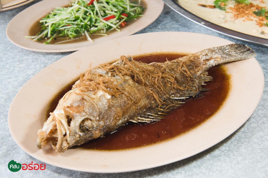 จานที่ขายดีที่สุดตลอดกาลคือ “ กุ้งนึ่งนมสด ” หรือเรียกให้เข้าใจง่ายๆ นี่คือ ไข่ตุ๋นนมสด ที่ใส่กุ้งนึ่งรสชาติหวานฉ่ำมาด้วย โดยรวมๆ หอม อร่อย มี Gimmick ที่มันกุ้งเข้ากับกลิ่นหอมของนมสดอย่างไม่น่าเชื่อ เนื้อ ไข่ตุ๋น นุ่มละเอียด เนียนละมุนลิ้น กระเทียมเจียวที่ราดมายังส่งกลิ่นหอมๆ ช่วยให้จานนี้ไม่ถึง 5 นาทีก็หมดไปอย่างรวดเร็ว (ยิ่งถ้ามากับแก็งค์เพื่อนๆ ก็จะเกิดอาการ ตักไม่ทัน เอาได้ ! ) อีกเมนูที่แนะนำให้ลอง คือ “ ปลาจั๊ม ” ที่น่าจะหมายถึงอาการของปลา ที่ “ กระโดด ” ลงกระทะน้ำมันร้อนจัด ทำให้เมื่ออกมาอยู่บนจานแล้ว กรอบอร่อยดีเหลือเกิน ก่อนราดด้วยซีอิ๊วหวานปรุงรส (หน้าตาออกมาคล้ายๆ ปลาผัดขิง) รสชาติเข้มข้น กลมกล่อม อย่าบอกใคร หรือ เมนูอย่าง ผัดโต้วเหมี่ยว ก็เป็นอีกหนึ่งเมนูจีนที่อร่อย และควรสั่งเป็นอย่างยิ่ง