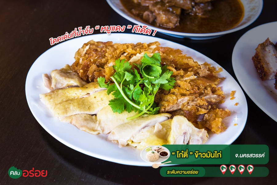 สิบปากว่า ไม่เท่าหนึ่งลิ้นลอง รู้สึกอย่างนั้นจริงๆ เมื่อแวะมาลอง “ ข้าวมันไก่โกตี๋ ” ขอบอกได้ว่าไม่ผิดหวัง ต้องมาลองให้รู้ด้วยลิ้น เพราะที่นี่ใช้ “ ไก่ไทยตอน เนื้อแน่น นิ่ม แต่ไม่เละ และไก่ทอดที่ทอดกรอบแบบทั้งชิ้น กินคู่กับน้ำ จิ้มสูตรไหหลำ แน่นเครื่องเต้าเจี้ยว แบบจีนแท้ๆ หรือ น้ำจิ้มพริกตำสีเขียวสด เปรี้ยวจี๊ดเผ็ดจี๋ หมูกรอบทอดข้างนอกเกรียมกรอบ ด้านในใขมันเยอะ หมูแดงสูตรไหหลำ สีชมพูสด หวานนุ่ม ชุ่มในเนื้อ กินคู่กับซีอิ๊วหวานที่ผ่านการปรุงรสอย่างดี ซี่โครงหมูอบ เนื้อนุ่มหวาน ไม่ติดกระดูก รสชาติคล้ายแกงมัสมั่น ที่นี่เด่นเรื่องน้ำจิ้ม รวมๆ แล้วบน โต๊ะมีน้ำจิ้ม 5 ถ้วย Mix & Match กันได้สนุก หนักไปทางหวานนิดหน่อย ปิดท้ายด้วยต้มซุป สูตรตุ๋นยาจีน ช่วยดับคาวและความร้อนรุ่มของเนื้อสัตว์ได้ดีนัก