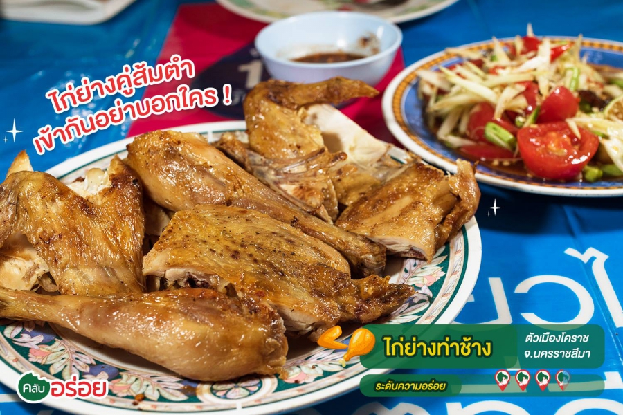“ ไก่ย่างท่าช้าง ” ร้านไก่ย่างเจ้าเก่าแก่ ประจำตัวเมืองโคราช ทีเด็ดอยู่ที่ไก่บ้านย่าง เนื้อแห้งๆ ย่างอย่างดี จน เนื้อเหนียวแน่นหนึบ หนังฉ่ำแห้งติดเนื้อ กินคู่กับตำลาวของทางร้านเรียกว่าเคี้ยวเพลิน !