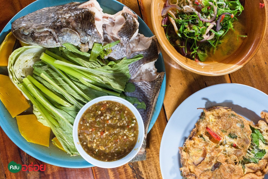 ปลานึ่งจิ้มแจ่ว / แกงผักหวาน / ไข่เจียวคาราบาว / หมูสมุนไพร / ลาบปลา