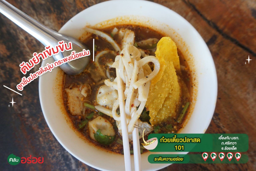 มื้อเที่ยงถ้ารู้สึกหิวและยังไม่รู้ว่าจะทานอะไร ต้องลองมาทานก๋วยเตี๋ยวรสเด็ด ที่ “ ร้านก๋วยเตี๋ยวปลาสด 101 ” ตั้งอยู่ตรงทางออกไปอ.ธวัชบุรี ไม่บอกก็รู้ว่าเมนูที่นี่เน้นปลาเป็นส่วนใหญ่ ว่าแล้วลองสั่งเมนูเด็ดของที่ร้านมาลิ้มรสกันหน่อย กับ ก๋วยเตี๋ยวปลาเส้นต้มยำ ก๋วยเตี๋ยวปลาต้มยำที่เสิร์ฟมาพร้อมกับเกี๊ยวทอด หอมน้ำต้มยำรสแซ่บ ไม่ต้องปรุงก็อร่อยแล้ว แถมพิเศษ ! คือเส้นที่ทำมาจากเส้นปลาที่ทางร้านบอกว่าทีเด็ดของที่นี่ เส้นปลาแทนเส้นก๋วยเตี๋ยว เคี้ยวกรุบเพลินๆ เน้นปลาล้วนๆ พร้อมลูกชิ้นปลาที่เด้งนุ่ม อร่อย นอกจากเมนูก๋วยเตี๋ยวแล้วที่ร้านยังมีเมนูยำรวม ที่รวมเอา เนื้อปลากระพง ลูกชิ้นปลา แมงกระพรุน รสชาติจัดจ้านซี๊ดซ๊าด ต่อด้วยเมนูเด็ดอีกอย่างคือ เนื้อปลาลวก ที่ทำมาจากปลากระพงล้วนๆ จิ้มกับน้ำจิ้ม รสชาติแซบเหาะอย่าบอกใคร