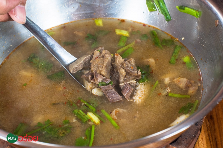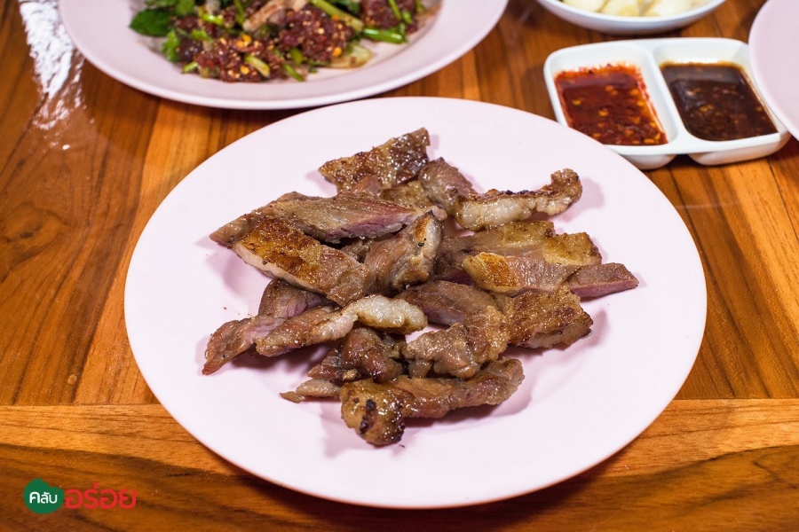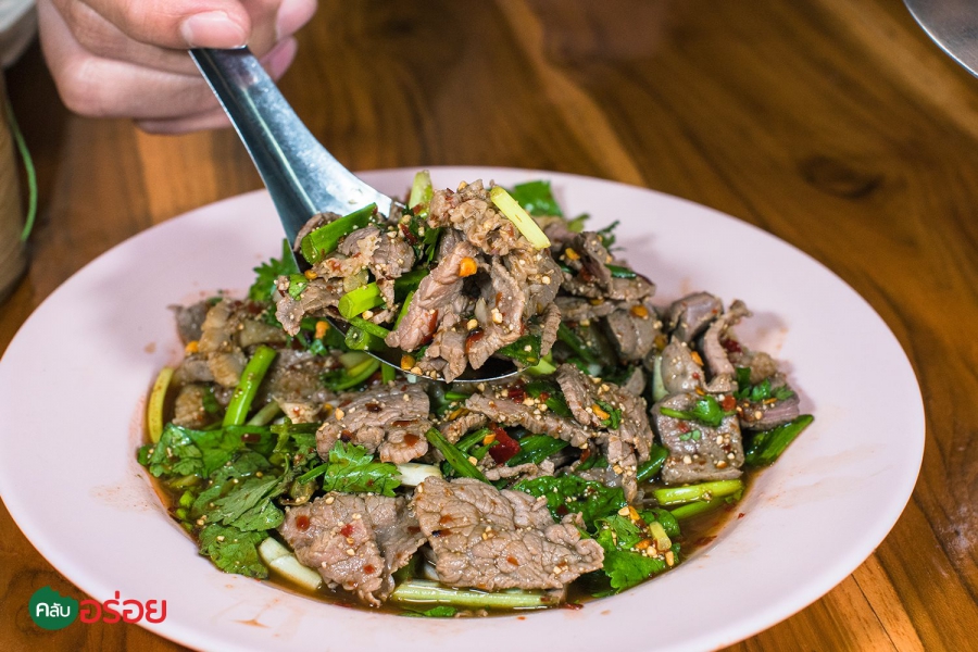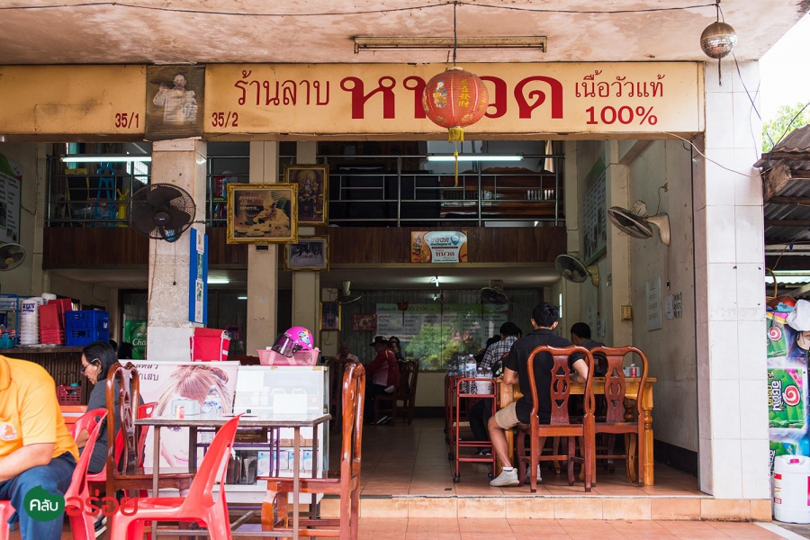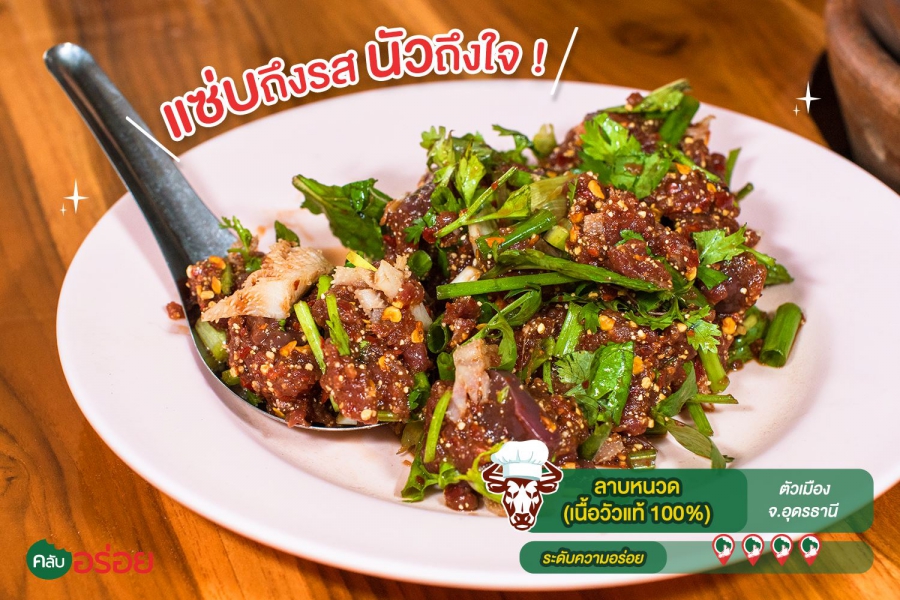 ร้านอาหารอีสานพื้นบ้านแท้ๆ ที่พูดชัดถ้อย ชัดคำว่า “ เนื้อ 100% ” ไม่มีอย่างอื่นเจอปน คงไม่ใช่เรื่องบังเอิญด้วยถ้าจะบอกว่า เนื้อของลุงหนวดแกเอามาทำอะไรก็อร่อยทุกจาน เมนูเด่นคือ “ ลาบ” จะลาบสุก ลาบดิบมีหมด รสชาตินัว และ เผ็ดสะท้านในแบบอีสานแท้ๆ หอมข้าวคั่วติดจมูก ถ้าอยากได้รสแบบพื้นบ้านจริงๆ แนะนำว่าให้สั่งแบบ “รสขม” ที่จะใส่ดีลงไปด้วย ถึงขมแต่ก็หวานปลาย ติดอยู่ในคอ ในลมหายใจ แหม่ มันชื่นใจ ! ถ้าจะให้ดีแนะนำว่าสั่งก้อยเนื้อสักจาน แค่สีของเลือดเข้มๆ ก็รู้แล้วว่ามันหวานขนาดไหน ยิ่งซดกับต้มเนื้อร้อนๆ ที่ใส่เครื่องในวัวมาครบทุกกระบวนท่า บอกเลย มีครบหมด หอม ขม และหวานปลายๆ รสชาตินัวแบบอาหารอีสานแท้ๆ ยากที่จะลืมครับ