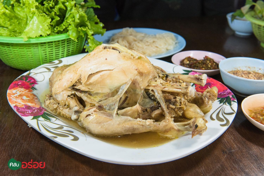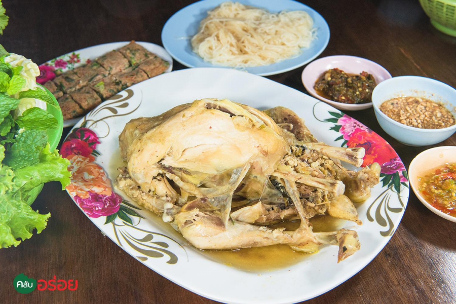 แป๊ะซะสูตรเฉพาะหนึ่งเดียวของไทย ที่เอาไก่บ้านไปนึ่งด้วยกรรมวิธีพิเศษ หมักกับตะไคร้ ใบมะกรูดและสมุนไพรพื้นบ้าน แล้วนึ่งด้วยเตาถ่านอยู่หลายชั่วโมง จนเนื้อไก่ เหนียวนุ่ม แห้ง แต่ฉ่ำไปด้วยกลิ่นสมุนไพร หวานเครื่องเทศเข้าเนื้อ จัดเครื่องเคียงทานคู่กับผัก และเส้นจันทร์นุ่มเหนียว มักห่อเป็นคำแล้วทานแบบชาวบ้าน พร้อมน้ำจิ้มต่างรส ที่มีให้เลือกถึงสามแบบ คือแจ่วปลาร้าหวาน แจ่วปลาร้าเปรี้ยว และน้ำจิ้มถั่วหวาน จะผสมหรือแยกจิ้มก็ตามแต่ชอบ ไก่เสิร์ฟแบบทั้งตัวสีเหลืองนวล ไม่มีกั๊ก เมนูเด่นอีกอย่างคือ “ ลาบปลาตอง ” ที่ใช้เนื้อปลากรายเน้นๆ ตำกับปลาร้าและเครื่องลาบ (หัวหอม พริก ข้าวคั่ว) จนเหนียวและรวมเป็นเนื้อเดียวกัน ก่อนห่อด้วยใบตองแล้วแล้วนำไปย่างบนเตาถ่าน หรือที่เรียกว่าการ หมก แบบฉบับอีสานแท้ๆ จนเนื้อนุ่มละมุนลิ้น เรียกว่าทุกเมนู รสชาตินัวและถึงรสอาหารพื้นบ้านอีสานจริงๆ ครับ