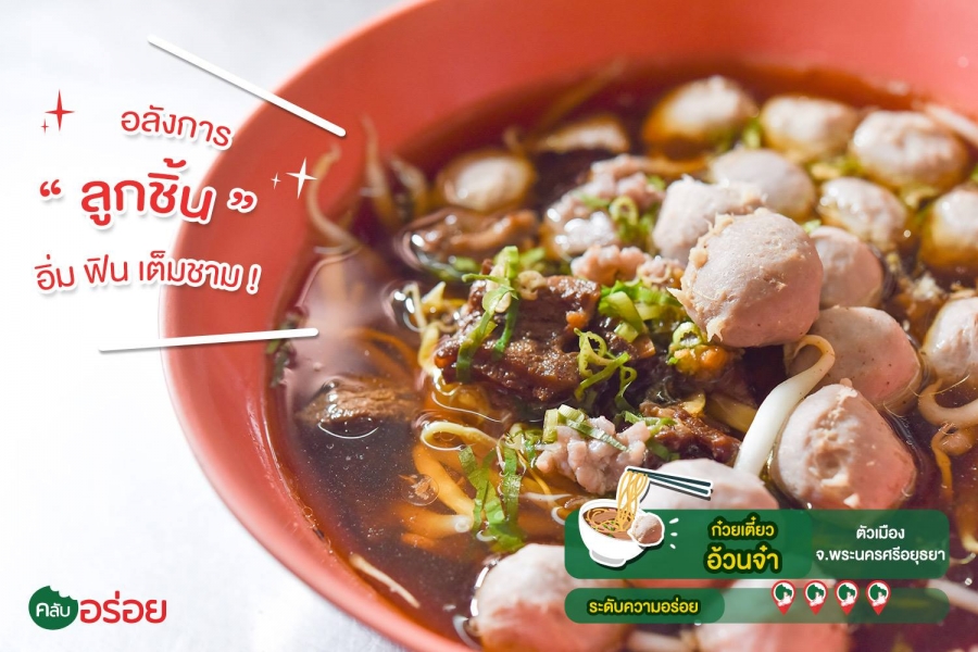 ร้านเล็กๆ ในตัวเมืองแต่เป็นขวัญใจคนอยุธยา กินกันตั้งแต่รุ่นสู่รุ่น เพราะอยู่ใกล้กับโรงเรียน หน่วยงานราชการต่างๆ ฟีลลิ่งประมาณ เลิกเรียนก็นัดเพื่อนมานั่งโซ้ยก๋วยเตี๋ยวกันที่นี่ แม้ว่าจะมีโต๊ะไม่มาก นั่งได้ 15 คนก็แน่นแล้ว แต่ก็ไม่มีเหงา มีคนเข้าเยอะพอสมควร ผลัดเปลี่ยนกันเข้ามาเรื่อยๆ ร้านก๋วยเตี๋ยวเนื้ออ้วนจ๋าทำลูกชิ้นเอง ตัวลูกชิ้นไม่ใหญ่มาก แต่เนื้อแน่น นุ่มเด้ง ได้รสชาติของเนื้อจริงๆ ถ้าสั่งแบบพิเศษจะได้ลูกชิ้นมาถึง 15 ลูก เต็มอิ่มจุใจ เรียกว่า..จุกกันไปเลย สำหรับน้ำซุปของร้านจะเป็นสูตรน้ำใส แต่รสชาติไม่ใสจ๋องแจ๋งเหมือนหน้าตา แต่กลับเข้มข้นกลมกล่อม มีความหอมในตัวอยู่แล้ว ทั้งกลิ่นเครื่องเทศ สมุนไพร เติมพริกป่นนิดหน่อยก็อร่อยเลย บะหมี่แห้ง คืออีกหนึ่งทีเด็ด เส้นอร่อยมาก เป็นบะหมี่เส้นแบนเหนียวนุ่มคลุกกับซีอิ๊วดำ กระเทียมเจียว เข้ากันดีกับเครื่องเคียง เนื้อสดนุ่มแทบละลายในปาก ส่วนเนื้อตุ๋น เนื้อเปื่อย สูตรลับเฉพาะที่มีเทคนิคการหมักขั้นเทพ ก็อร่อยไม่ผิดหวัง ใครที่ชื่นชอบก๋วยเตี๋ยวที่โรยผักโรยหอม พร้อมพริกไทย ซดกับน้ำซุปร้อนๆ ขอบอกร้านนี้..ฟินเหลือหลาย !