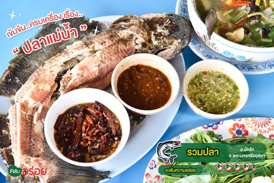 อยากกินปลา… เค้าว่าต้องมาที่นี่ “ รวมปลา ผักไห่ ” จักรวาลบ้านทุ่งของคนชอบกินปลา ที่นี่มีเมนูสารพัดปลาแม่น้ำเสิร์ฟขึ้นโต๊ะ ในรสชาติจัดจ้านครบเครื่องไม่เป็นรองที่ไหน ไม่ว่าจะปลาเค้า ปลาคัง ปลากระทิง ปลาเนื้ออ่อน ปลาเทโพ ปลาหมอ ปลาช่อนก็มีหมด เลือกสั่งกันได้ตามใจชอบ แม่ครัวเอกของร้านเสกให้ได้ตามสั่ง ระหว่างสั่งหรือก่อนกลับ อย่าลืมแวะเดินสำรวจรอบๆ ร้าน เผื่อจังหวะที่จับปลาตัวโต ไซส์บิ๊กมาได้ ทางร้านก็จะเอาให้ดู เพิ่มดีกรีความหิวให้ได้อีกหลายเท่านัก เมนูแรก “ ปลาช่อนเผาสะเดาน้ำปลาหวาน ” จานนี้ปลาช่อนตัวโต เนื้อหนึบ ยิ่งเคี้ยวยิ่งหวาน ทานคู่กับน้ำปลาหวานแสนอร่อย ตัดรสขมด้วยสะเดา เข้ากันดีอย่าบอกใคร ใครไม่ถนัดของหวาน จะจิ้มกับน้ำจิ้มซีฟู้ดสูตรหนักมะนาว หรือน้ำจิ้มพริกเผาที่เด่นกลิ่นแมงดาเหลือหลาย ก็เด็ดดวงไม่แพ้กัน อีกเมนูที่ไม่พูดถึงไม่ได้ “ ต้มโคล้งปลากระทิง ” นอกจากลวดลายชวนสยองขวัญบนตัวแล้ว หนังของปลากระทิงย่างไฟ ก็ยังหอมโดดเด่นและเคี้ยวหนึบราวกับทานเบคอนรมควัน แถมด้วยน้ำต้มโคล้งที่ปรุงด้วยพริกตำแบบไม่มีกั๊ก เห็นสีใสๆ แบบนั้น แต่พาเหรดเครื่องต้มยำมาแน่นเต็มชาม จน เผ็ด เปรี้ยว ระดับนรกแตก ไม่เคยเจอที่ไหน เพราะค่อยๆ เร่งดีกรีความเผ็ดจากคำแรกอย่างน่าอัศจรรย์ “ ปลาค้าวทอดน้ำปลา ” อีกหนึ่งเมนูที่คู่ควรแก่การนำมาตัดรสเผ็ด เพราะทอดออกมาได้กรอบ จนมีสีเหลืองทอง หอมกรุ่นทั้งหนังด้านอกและเนื้อด้านใน ข้าวสวยร้อนๆ ซักจาน ฟินจนมื้อเย็นแน่นนอนครับ !