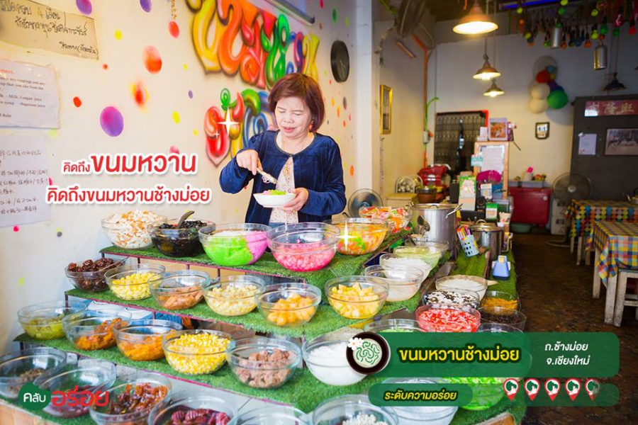 หลังจากทานของคาวกันมาแล้วลองแวะมาเติมความหวานกันกับร้าน “ขนมหวานช้างม่อย” ต้องบอกเลยว่าร้านนี้เป็นร้านขนมหวานที่เปิดกันจนถึงตีหนึ่ง หรือบางคืนก็ตีสอง ด้วยเมนูขนมหวานที่มีตัวเครื่องให้เลือกอย่างมากมายไม่ต่ำกว่า 30 อย่าง แถมเครื่องรวมมิตรเกินกว่าครึ่งนั้นทางร้านเป็นคนทำขึ้นมาเอง เมื่อเลือกเครื่องกันจุใจแล้ว ต่อมาก็มาเลือกน้ำราดกันต่อเลย มีทั้งน้ำกะทิ น้ำลำไย และน้ำหวานสีสันต่างๆ แต่ขอแนะนำเลยครับว่าต้องลองน้ำกะทิของทางร้าน ซึ่งหอมมาก มาก มาก จริงๆ แค่กำลังจะเอาช้อนเข้าปาก กลิ่นก็ลอยเตะจมูกก่อนแล้ว หรือหากใครไม่ชอบน้ำกะทิ ก็ลองน้ำลำไยซึ่งหวานน้อยลงมาหน่อย แถมมีเนื้อลำไยอบแห้งให้ทานควบคู่กันอีกด้วย หากใครอยากทานของหวานยามค่ำคืน แล้วหาทานที่ไหนไม่ได้ ให้แวะมาที่ร้าน “ขนมหวานช้างม่อย” แห่งนี้ได้เลยครับ รับรองว่าจะไม่ทำให้คุณผิดหวัง