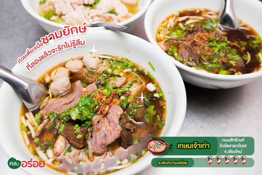 “ เกษมเจ้าเก่า ” เพียงแค่คำว่า “เกษม” ก็โบราณอยู่แล้ว ยังตามมาด้วย “เจ้าเก่า” ตอกย้ำความเก่าแก่ของร้านนี้ได้เป็นอย่างดี เพราะร้านนี้เปิดมาตั้งแต่สมัยเจ้าของร้านยังเป็นหนุ่มสาววัยแรกแย้ม ปัจจุบันเปิดร้านมามากกว่า 40 ปี ซึ่งแน่นอนว่าระยะเวลาขนาดนี้ เป็นเครื่องยืนยันถึงรสชาติความอร่อยของทางร้านได้เป็นอย่างดี จุดเด่นที่สุดของทางร้านคือ “เนื้อเปื่อย” เพราะเป็นสูตรลับเฉพาะที่ต้องใช้เวลาบ่มเพาะความอร่อยถึงค่อนวัน อีกทั้งยังไม่สามารถทำมากไปกว่าปริมาณที่กำหนดไว้ได้ เพราะเจ้าของร้านมีอายุมากแล้ว จึงทำให้ไม่สามารถทำงานหนักเหมือนเช่นวัยหนุ่ม ด้วยรสชาติของ "เนื้อเปื่อย" ที่มีกลิ่มหอมเย้ายวน และมีความอ่อน นุ่ม หวานน้ำซุป แถมในบางชิ้นก็มีเส้นเอ็นสอดแทรกระหว่างชั้นเนื้อ ทำให้เคี้ยวกรุบกรอบขึ้น ทานร่วมกับเส้นก๋วยเตี๋ยวร้อนๆ ซดน้ำซุปตามอีกซักครั้งหนึ่ง ช่างเป็นรสชาติที่พึงใจยิ่งนัก เมื่อลองเนื้อเปื่อยเสร็จแล้ว ก็ลองเนื้อสดดูบ้าง อื้ม… อร่อยไม่แพ้กัน เพราะทั้งนุ่ม หอมเครื่องเทศ แถมไม่มีความเหนียวเลย บ่งบอกถึงการเตรียมวัตถุดิบมาเป็นอย่างดี ด้วยรสชาติอร่อยขนาดนี้ จึงไม่แปลกใจเลยที่ “เกษมเจ้าเก่า” จะเป็นร้านก๋วยเตี๋ยวเนื้อขวัญใจชาวเชียงใหม่มาอย่างยาวนาน