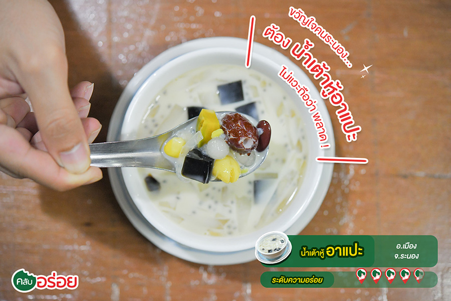 หากผ่านมาหลังโรงพยาบาลระนองช่วงเย็นๆ ถึงหัวค่ำ อย่าแปลกใจถ้าจะมีคนจำนวนมาก บ้างยืน บ้างนั่ง เข้าคิวซื้อ “ น้ำเต้าหู้ ” อาแปะอยู่เป็นประจำทุกวัน เพราะที่นี่คืออีกหนึ่งร้านเด็ด “ สภาน้ำเต้าหู้ยามค่ำ ” ซึ่งเป็นที่รักของคนระนองมาแสนนาน แม้ปัจจุบันอาแปะจะอายุมากแล้ว แต่ดีกรีความอร่อยของน้ำเต้าหู้สูตรดั้งเดิมก็ไม่ได้ลดน้อยลงเลย น้ำเต้าหู้สูตรโบราณขนานแท้ เสิร์ฟร้อนๆ หอมกลิ่นถั่วเหลืองโชยมาชื่นใจ หากสั่งแบบทรงเครื่องก็จะได้เครื่องเคียงแบบแน่นๆ อิ่มฟินจนอยู่ท้อง สามารถเลือกระดับความหวานได้ไม่ต้องกังวลเรื่องความอ้วน และมีทั้งแบบร้อนและแบบเย็น นอกจากน้ำเต้าหู้ก็ยังมีเมนู “ น้ำเต้าฮวยน้ำขิง ” หอมๆ ซดง่าย ลื่นคอ ไม่เผ็ดร้อนจนเกินพอดี “ บัวลอยไส้งาดำ ” คืออีกหนึ่งทีเด็ด นุ่ม ลื่น ละลายหายไปในปาก เต็มปากเต็มคำ นอกจากนั้นก็ยังมีเมนูโดนใจวัยรุ่นอย่าง “ เต้าฮวยฟรุตสลัด ” “ เฉาก๊วยนมสด ” สั่งมาลองกันได้ทุกเมนู เพราะอร่อย ให้เยอะ ป้าๆ น้าๆ ใจดี ยิ้มแย้มตลอด ที่สำคัญยังเปิดเพลงจีนเคล้าอารมณ์จนต้องบอกว่า ฟีลมันได้ ! วันไหนแดดร่มลมตก ฝนไม่เทลงมา นั่งซดน้ำเต้าหู้อุ่นๆ หลังมื้อเย็น มันฟินหัวใจสุดๆ เลยล่ะครับ