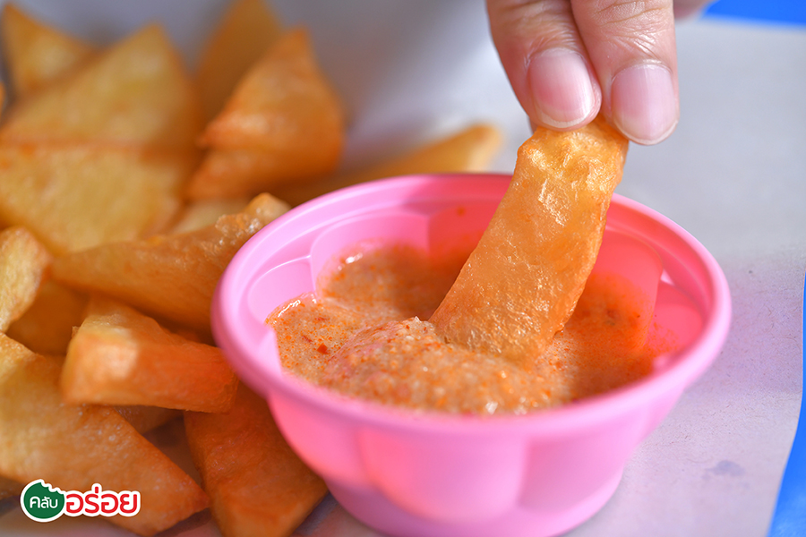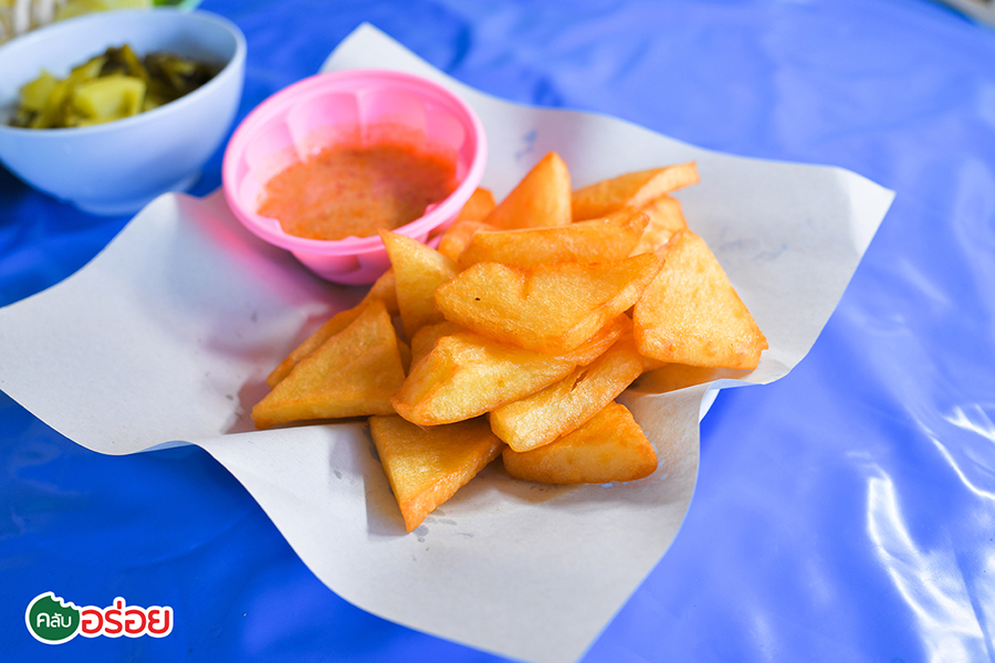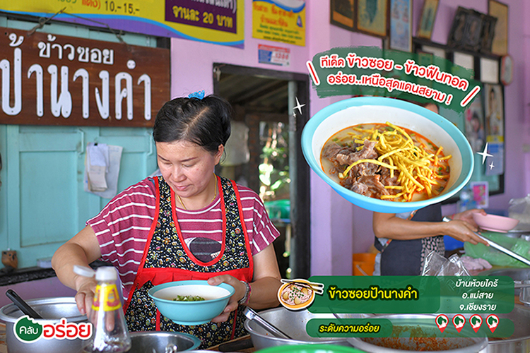 นอกจากข้าวซอยที่อร่อยขึ้นชื่อ เมนูห้ามพลาดอีกอย่างของร้าน “ ข้าวซอยป้านางคำ ” ก่อนแวะขึ้นไปสักการะ “ พระธาตุดอยตุง ” คือ “ ข้าวฟืนทอด ” ที่ทำมาจาก ถั่วลันเตา ทอดกรอบออกมาเป็นสีเหลืองทอง ข้างนอกกรอบ เนื้อในนุ่มละมุน ขอเรียกว่าเป็น “ เฟรนช์ฟรายส์ทอดแห่ง อ.แม่สาย ” จิ้มกับน้ำจิ้มถั่วเป็นออเดิร์ฟ เป็นต้องสั่งกันทุกโต๊ะ ก่อนจัดหนักจัดเต็มกับข้าวซอย คนพื้นที่รู้ดีกันว่าพิกัดนี้นี่แหละ ถูกปากที่สุด เพราะที่นี่เป็นร้านดั้งเดิม กินมาแต่อ้อนแต่ออด มีเส้นให้เลือกหลายแบบ ต้นตำรับคือ “ ข้าวซอย ” ขอเรียกว่าเป็นสูตรน้ำใสเพราะน้ำไม่ข้นคลั่ก แต่รสชาติเข้มข้นถึงใจ ถึงกลิ่นเครื่องแกงลงตัว มีความพิเศษตรงที่ใช้เส้นไม่เหมือนที่ใด เพราะที่อื่นจะใช้เส้นแบน แต่ของป้านางคำ แกใช้เส้นกลมและใหญ่แบบเส้นบะหมี่ (คล้ายๆ เส้นราเมน) เช่นเดียวกับ “ น้ำเงี้ยว ” มีให้เลือกทั้งเส้นใหญ่ เส้นเล็ก และเส้นขนมจีน แถมยังโรยหน้าด้วยเครื่องหมูสับผัดแบบน้ำพริกอ่อง ก่อนกินต้องคลุกเคล้าให้เป็นเนื้อเดียวกัน เรียกว่ามีเอกลักษณ์เฉพาะตัวไม่เหมือนที่ไหน บนโต๊ะจัดเครื่องเคียงไว้ทานคู่กันแน่นขนัด “ ผักกาดดองยำ ” หรือกิมจิแม่สาย คือสุดยอดเครื่องเคียงหนึ่งเดียวในไทย รสชาติเปรี้ยวเผ็ด เด็ดที่ผักกาดดองกรอบ ตักกินคู่กับอะไรก็เข้ากันดีทั้งสิ้นครับ