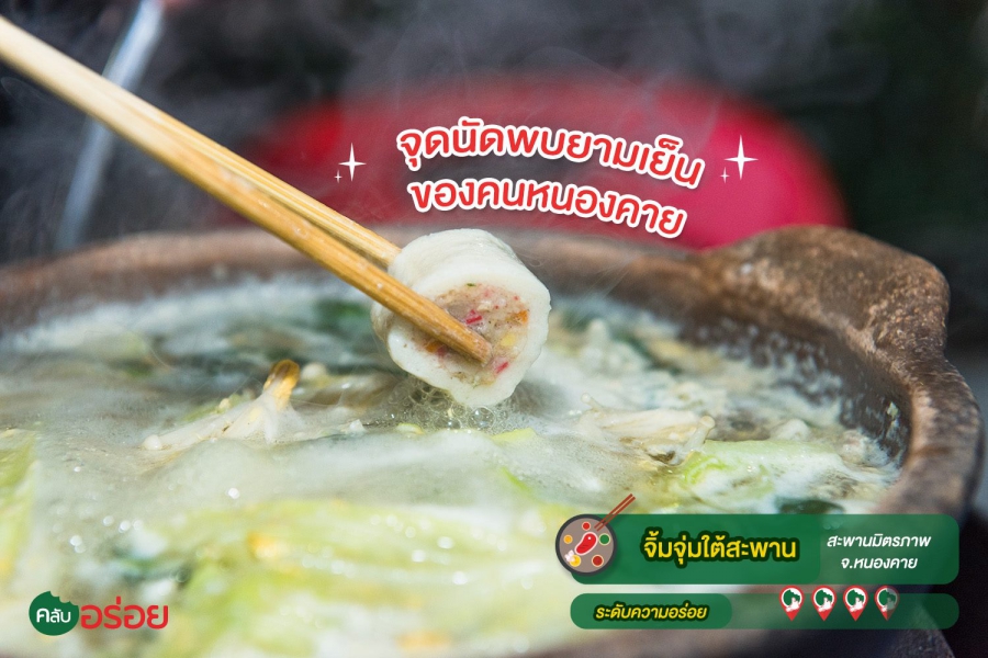 “ จิ้มจุ่มใต้สะพาน ” ร้านนี้วัยรุ่นหนองคายรู้จักกันดี เพราะนอกจะเป็นเมนูที่กินง่าย กินสนุก เหมาะแก่การเป็นที่นัดเมาท์มอยกันระหว่างเพื่อนๆ “ น้ำซุป ” ในหม้อดินต้มเตาถ่าน ของที่นี่ก็มีรสชาติหวานกลมกล่อม อร่อยเป็นเอกลักษณ์ ไม่เหมือนที่ไหน วัตถุดิบทั้งผักและเนื้อสัตว์สดได้มาตรฐาน ทานคู่ กับน้ำจิ้มของทางร้านที่มีให้เลือกถึงสามแบบ คือน้ำจิ้มซีฟู้ด น้ำจิ้มจิ้มจุ่ม (หวาน) แต่ที่สุดต้องยกให้ “ แจ่วเพี้ย ” น้ำจิ้มรสขม ที่เข้ากันเป็นปี่เป็นขลุ่ยกับเนื้อต้มร้อนๆ เมนูมีให้เลือกไม่เยอะ แต่ก็ถือว่ามากพอสมควร ทั้ง (เนื้อหมู เนื้อวัว ตับหมู ไส้อ่อน สไบนาง เซี่ยงจี้ เต้าหู้ปลา ปลาหมึกยัดไส้ กุ้ง หมึก ปลากระพง ล ราคาไม่แพงถือว่าคุ้มค่า และควรค่าแก่การเป็นจุดเช็คพักเช็คอินครับ