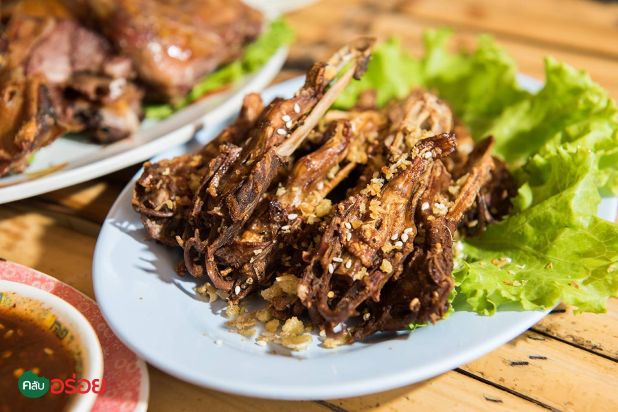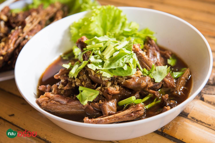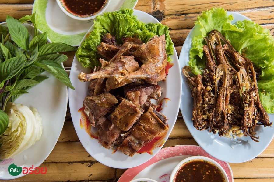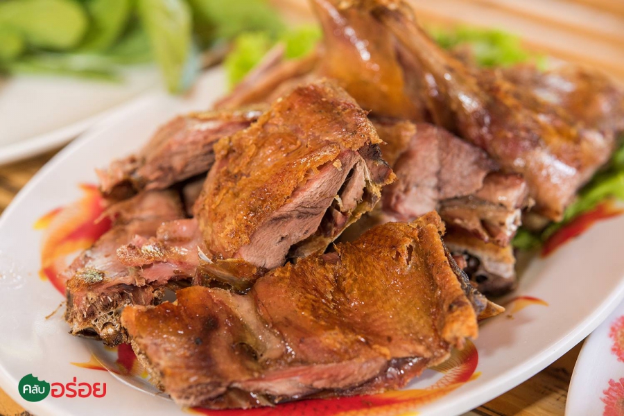 - เมนูเด็ดของที่นี่คือเป็ดย่างเกลือที่ผ่านการย่างจนหนังกรอบเป็นสีน้ำตาลอ่อน และเนื้อข้างในอมสีชมพูระเรื่อ