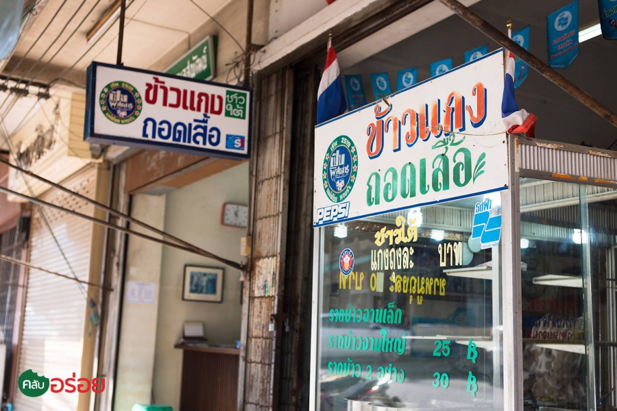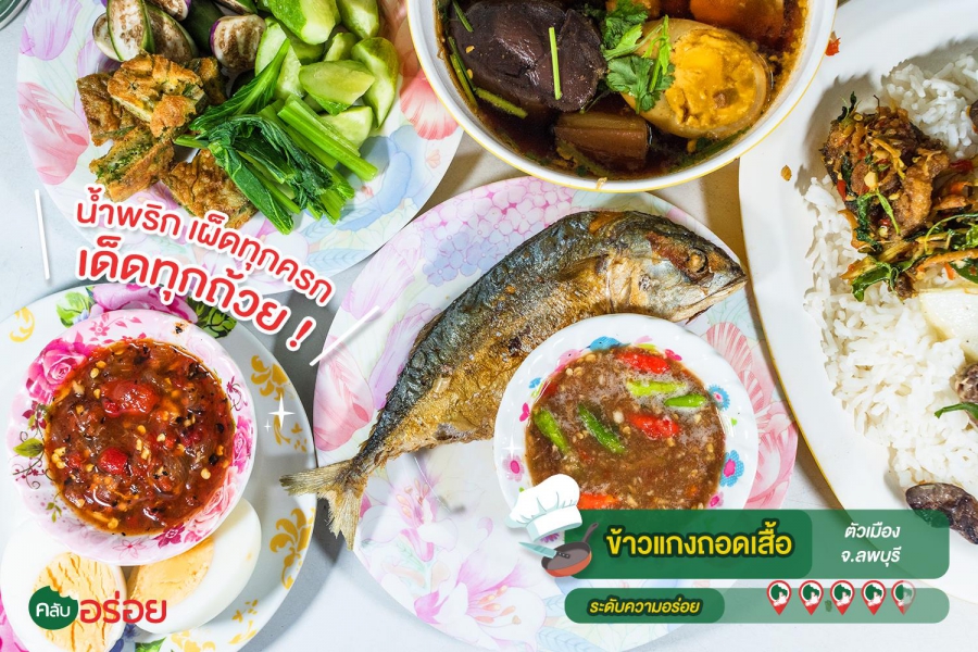 ร้านข้าวแกงเก่าแก่ที่คนลพบุรีคุ้นเคยกันดี ที่มาของชื่อ “ ข้าวแกงถอดเสื้อ ” ก็เนื่องมาจากคุณลุงเจ้าของร้าน เมื่อก่อนชอบนั่งถอดเสื้อขายข้าวอยู่หน้าร้าน คนแถวนั้นเลยเรียกติดปากกันเรื่อยมา จุดเด่นของร้านนี้อยู่ที่ “ น้ำพริก ” แม้จะอยู่เมืองลิง แต่คนที่นี่ชอบกินน้ำพริกเป็นชีวิตจิตใจ ร้านนี้ตำน้ำพริกทุกถ้วยได้ถึงเครื่องถึงรส แซ่บสะท้านในแบบชาวใต้แท้ๆ ที่ต้องสั่งกันทุกโต๊ะคือ น้ำพริกกะปิ-ปลาทู ที่ใช้กะปิอย่างดีจากหลังสวน โขลกเข้ากับน้ำปลา น้ำตาลปี๊ป และพริกขี้หนูสวน ได้แบบถึงใจ รสชาติเข้มข้น เปรี้ยว เค็ม หวาน และ เผ็ดพริกขี้หนูครบรส ที่นี่ยังมีน้ำพริกอีกหลายอย่าง ทั้ง น้ำพริกตาแดง น้ำพริกปลาย่าง น้ำพริกเผากุ้ง น้ำพริกปลาร้า และ น้ำพริกนรกกุ้ง ขอบอกว่าทุกถ้วยอร่อยและมีเอกลักษณ์เป็นของตัวเอง แต่มีจุดร่วมที่เหมือนกันก็คือ การขับกลิ่นหอมและรสชาติเผ็ด ของพริกและวัตถุดิบเฉพาะ (เช่นกลิ่นปลาย่าง กลิ่นพริกเผา) ออกมาได้อย่างถึงอารมณ์ลิ้นมากๆ ครับ
