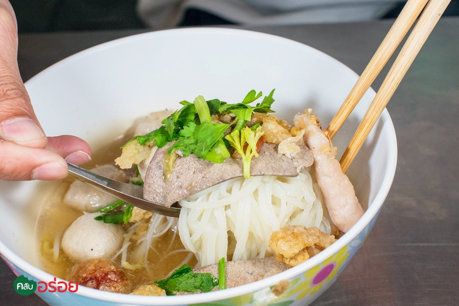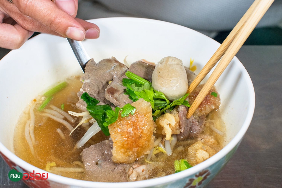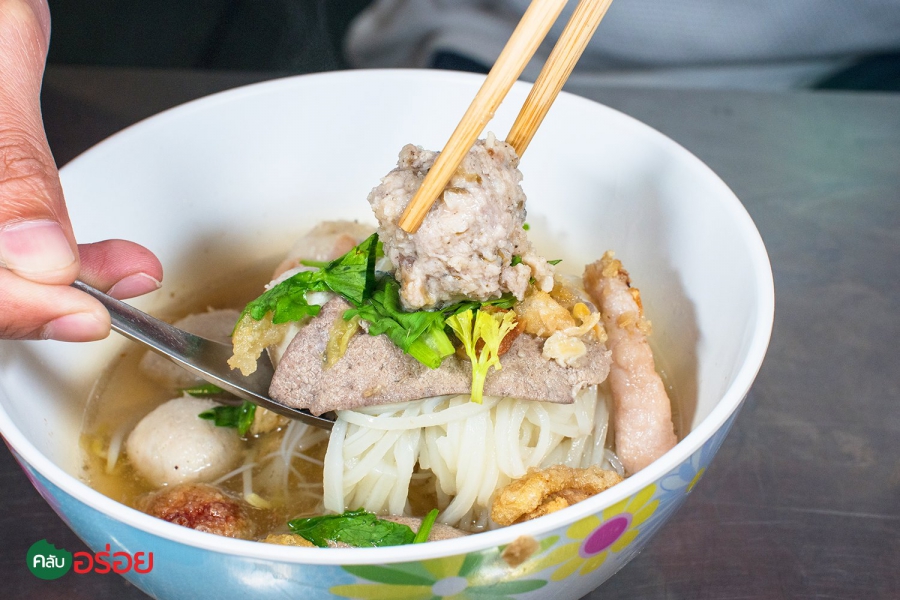 ก๋วยเตี๋ยวน้ำใส ที่น้ำไม่ใสจ๋องแจ๋ง เพราะไม่ว่าจะสั่งก๋วยเตี๋ยวหมู หรือ เนื้อ เราก็จะเจอแต่ เครื่อง เครื่อง และ เครื่อง !!! อัดแน่นมาเต็มชาม จุดเด่นคือเป็นก๋วยเตี๋ยวน้ำใส ที่น้ำซุปต้มกระดูกมีรสชาติกลมกล่อม และมีลูกชิ้นทำเองรสชาติดีหลากหลายเป็นเครื่องเครา พร้อมด้วย หมูสับ และ กากหมูเจียวหอม ที่รสชาติอร่อยเป็นเอกลักษณ์ ที่ร้านมีทั้งหมูและเนื้อ (ชิ้น-สด-สับ-ตับ-เปื่อย-ตุ๋น) แบบต้มแยกหม้อกัน เป็นก๋วยเตี๋ยวขวัญใจคนพื้นที่ที่มาจ่ายตลาด แถวตลาดบนเมือง มาอย่างยาวนานครับ !