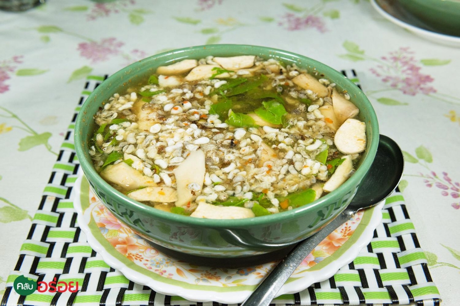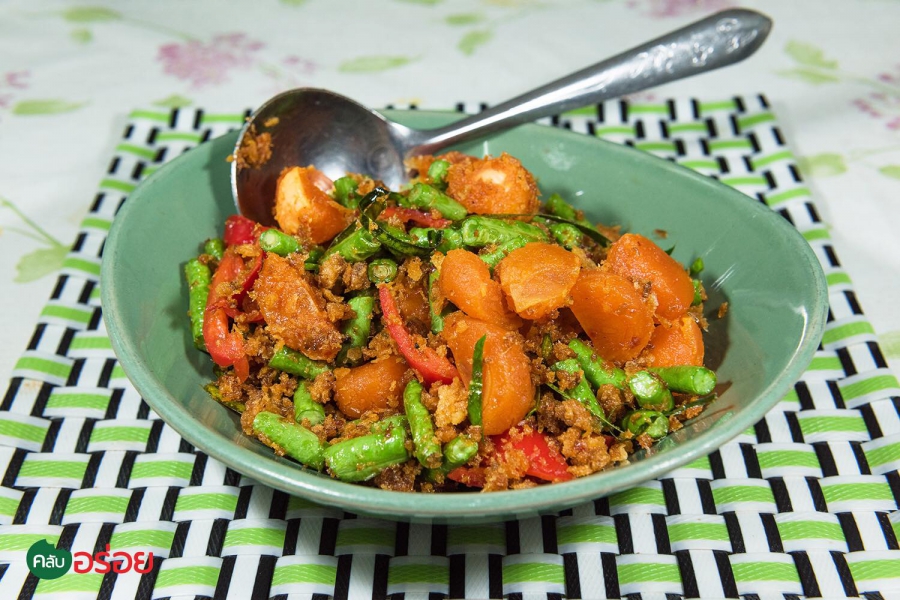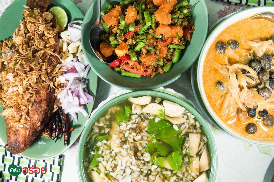 ไข่เค็มผัดพริกขิงปลาดุกฟู / แกงเลียงไข่มดแดง / แกงคั่วเห็ดเผาะปลากราย / ปลาส้มฟักทอด
