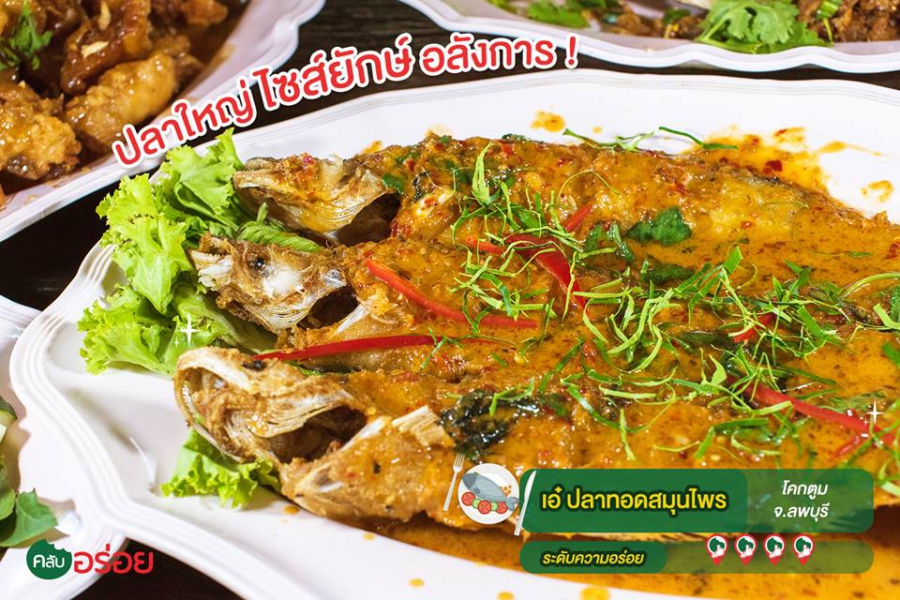 มาลพบุรีเค้าว่าต้องกินปลาแม่น้ำ แล้วถ้าอยากกินปลาแม่น้ำที่ลพบุรี “ เอ๋ ปลาทอดสมุนไพร ” คือ THE MUST ! สุดยอดร้านอาหารเมนูปลาแม่น้ำแห่งลพบุรีที่ต้องมาลองให้ได้สักครั้งในชีวิต เพิ่มดีกรีความอร่อยขึ้นอีกขั้นด้วยการทำเมนูแบบ “ สมุนไพร ” ที่มีสมุนไพรพื้นบ้านหลายอย่างเป็นเครื่องเคียง ตามสไตล์อาหารป่า จุดเด่นของที่นี่คือ ใช้ปลาสด ปลาใหญ่ ไซส์ยักษ์ ไม่เหมือนที่ไหน บอกเลยว่าไม่เคยเจอร้านไหนเสริ์ฟปลาตัวโต ตัวใหญ่ขนาดนี้ ซึ่งส่วนใหญ่จะเป็นปลาจากเขื่อนป่าสัก ก่อนเดินเข้าร้านก็ต้องประเมินกำลังกระเพาะตัวเองให้ดีเสียก่อน เพราะที่นี่มีปลาทุกชนิดวนกันไปในแต่ละวันที่จับได้ เช่น ปลาคัง ปลาเนื้ออ่อน ปลาช่อน ปลาน้ำเงิน ปลาตะเพียน เมนูขึ้นชื่อของที่นี่คือ ลาบปลาตะเพียน ที่ใช้ปลาตะเพียนไซส์ XL เลาะเนื้อออกมาทำลาบรสชาติเข้มข้น แถมยังสับเสียจนจนไร้กาง จากนั้นก็ขอดเกล็ดมาทอดกรอบโรยหน้าให้ยิ่งหน้ากินขึ้นอีกเท่าตัวครับ